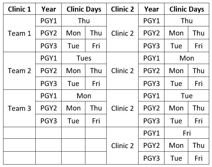 Resident scheduling is complex due to multiperiod assignments and multiple constraints, including ACGME work-hour regulations and demanding coverage of the residency program’s inpatient services.2,3 For example, an analysis of scheduling complexity for a 24-resident family medicine (FM) program with only nine annual rotations resulted in more than 3,000 variables and more than 850 constraints3 Programs embracing a C-3 model can produce higher quadruple-aim care and have been endorsed by national organizations.4 Studies on FM residencies embracing these models have shown the feasibility of tackling complex scheduling with a two-pronged approach: separate master block schedules for core rotations and continuity clinics.5 The literature has highlighted the superiority of automated approaches to residency scheduling6 due to its ability to decrease drafting time,7 increase schedule quality,7,8 and improve resident satisfaction.8