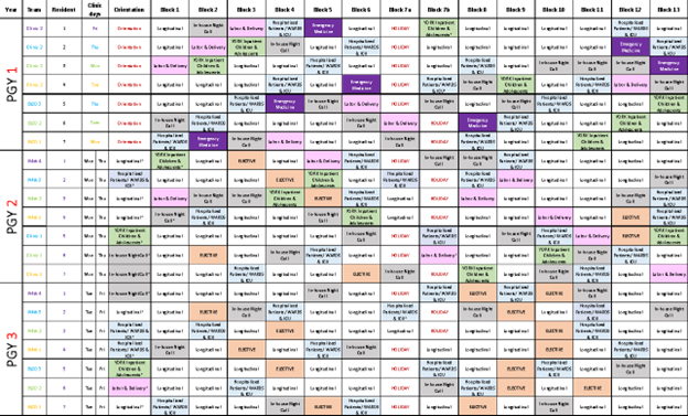 Our 7-7-7 FM residency program utilized schedule templates constructed in hierarchical stages by postgraduate year (PGY). Starting with designated resident clinic days for each PGY class, we established a clinic team template (Table 1).  A separate template (Table 2) designated alternate days to coordinate residents on hospital service rotations. Subsequently, a 13-block hospital service and longitudinal subspecialty rotation block schedule (Figure 1) was constructed (separate Microsoft Excel sheets built specific longitudinal subspecialty rotation blocks and continuity clinics). The Excel “countif” function confirmed accuracy and fairness of resident block schedules facilitating a threefold tabulation: (1) even numbers of resident core rotations, longitudinal blocks, vacation and electives; (2), even numbers of subspecialty rotations; (3) a balance of preceptors, clinical staff, and provider availability at clinics.